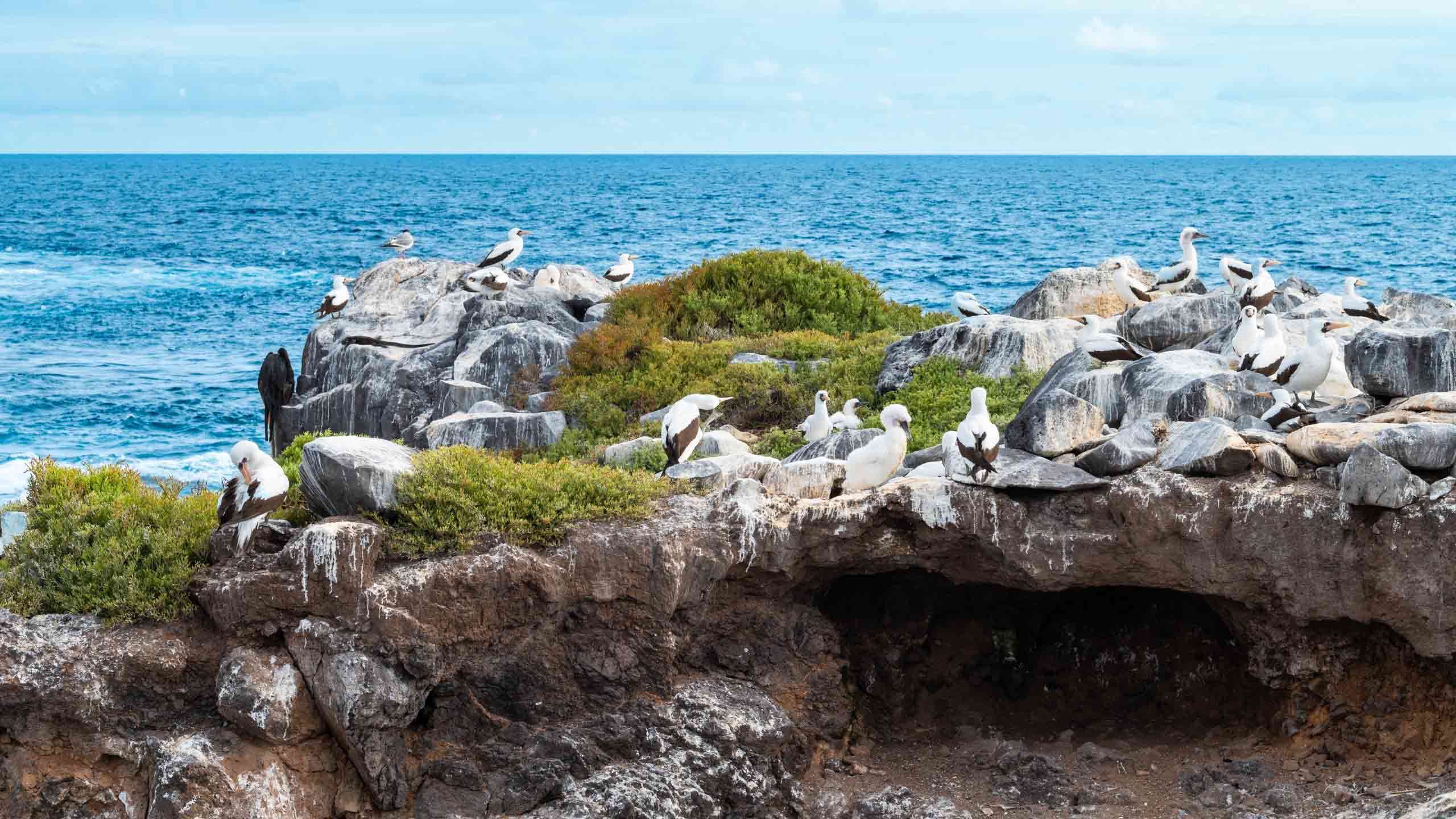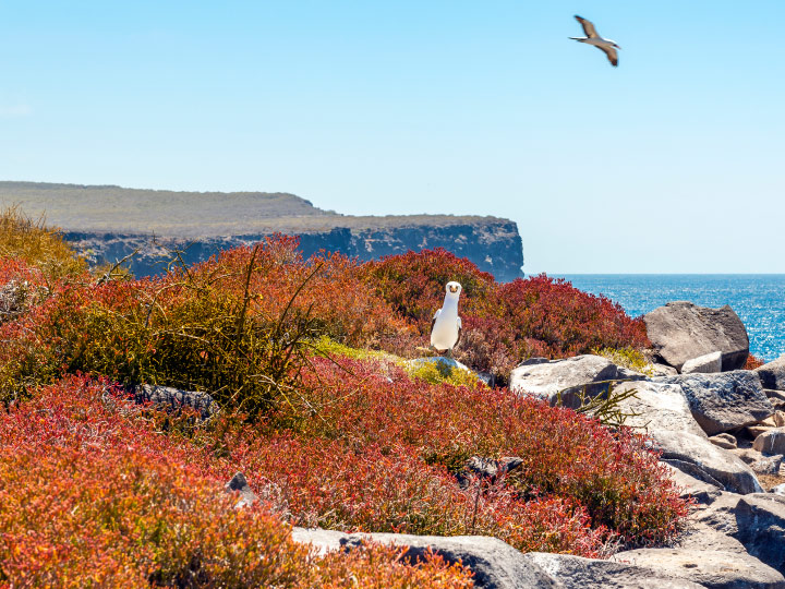 In the afternoon, head to South Plazas, one of the twin islands, where the northern sibling is reserved for scientific research. This small islet teems with wildlife; Galápagos land iguanas greet you from beneath the prickly-pear cacti, eager for their fruit. The island is alive with sea lions, showcasing their social dynamics, from playful pups splashing in tidal pools to protective males guarding their territories. Your trail leads to a breathtaking cliffside vantage point, offering views of seabirds like frigatebirds, red-billed tropicbirds, boobies, swallow-tailed gulls, and pelicans soaring above. The island's unique character is enhanced by a lush carpet of reddish succulents interspersed with scattered cacti, making South Plazas a truly captivating destination. Take in the excitement of the day and relax onboard before dinner. |