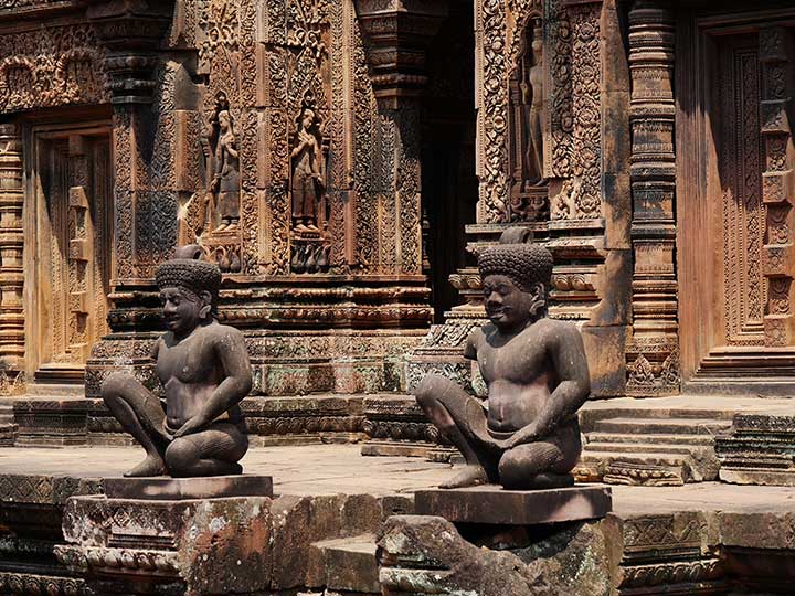 Approx. 44 km (27 miles) 2-3 hours biking Today is focused on temples. Our first stop is a temple poetically known as the “Citadel of Women,” and dedicated to the Hindu god Shiva. The Banteay Srei temple was built in the 10th century and is smaller than most in Angkor. However, its incredibly detailed carvings make it famous. Made from pink sandstone, the intricate reliefs are so finely cut that many consider them to be the finest stone carvings in the entire Angkor region. Interestingly, it wasn’t built by a monarch but by two royal scholars and courtiers who served as trusted advisors to King Rajendravarman II. Lunch follows after the temple visit, then we hop on the saddles and ride toward Siem Reap along quiet countryside roads. Our path flaunts classic rural Cambodia, where you find wide rice paddies, water buffalo grazing in the fields, and farmers working under broad-brimmed hats. In some villages, you may even catch the sweet scent of palm sugar being boiled down from palm sap. Before long, we enter Siem Reap through the vast Angkor Archaeological Park. Dinner is yours to enjoy, and because Seap Reap is known for its lively food scene, you have lots of good options to try. Local dishes such as beef lok lak with pepper-lime sauce, grilled pork with sticky rice, wood-fired pizza, or crispy spring rolls are just the start of an evening full of authentic Khmer flavours. |