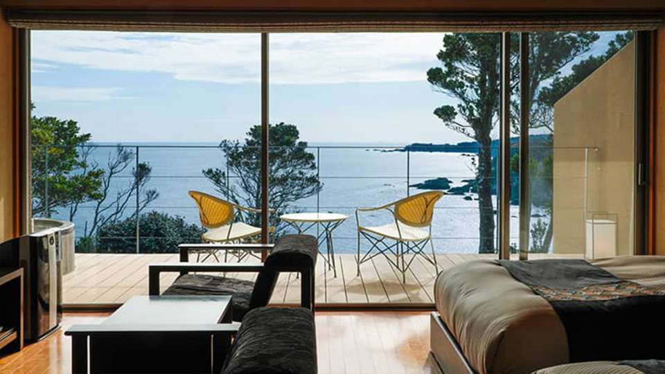 closeSurrounded by the deep azure waters of Katsuura Bay, Kumano-bettei Nakanoshima is the sole accommodation on the blissfully secluded private island of Nakanoshima. One of its most captivating highlights is the opportunity to witness the pristine beauty of Nachi Bay and the majestic mountains at sunset, from the comfort of every room's own onsen (hot springs). Immerse yourself in one of six natural hot spring sources on the island, featuring both indoor and outdoor baths.