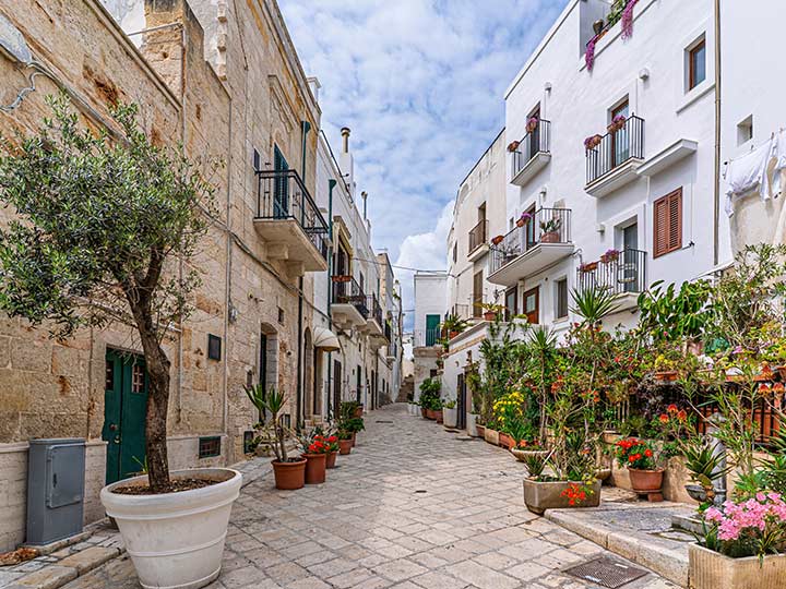 Approx. 61km (38 miles), 3 hours biking, Elevation gain: 330m (1083 ft) Today's destination is the beautiful town of Ostuni, also known as the "White City." Sitting on a hill with stunning views of the Adriatic Sea, Ostuni is surrounded by vast fields of ancient olive trees, a defining feature of the Puglia region. Its narrow streets, whitewashed buildings, and historic centre make it a must-see. Before arriving in Ostuni, we'll stop in Monopoli, a charming coastal town known for its picturesque harbour, colourful fishing boats, and historic old town. Here, you'll have time to enjoy a second breakfast or a coffee by the water, soaking up the relaxed seaside atmosphere. Once we reach Ostuni, you'll have time to explore its winding streets, visit local shops, or simply take in the panoramic views. After completing the ride, you can choose to return by van, giving you the chance to enjoy a relaxing afternoon. It’s the perfect way to end another fulfilling day of exploring Puglia by bike. |